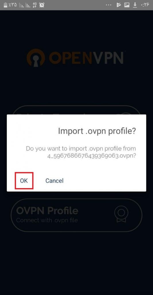 فایل کانفیگ را از پشتیبانی دریافت نموده و یکی از آنها را لمس نمایید.سپس از شما سوال می شود با کدام برنامه اجرا شود و شما برنامه نصب شده OpenVPN را انتخاب می نمایید که با تصویر پایین روبرو می شوید که مانند تصویر گزینه OK را انتخاب می نمایید.
