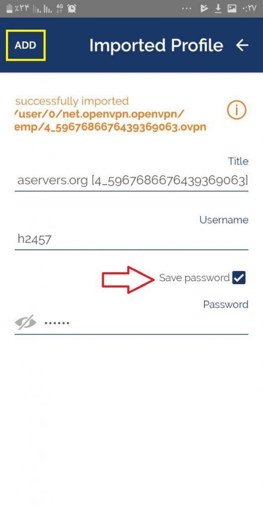 مانند تصویر زیر گزینه Save password را انتخاب نموده تا بتوانید نام کاربری و رمز اکانت خود را وارد نمایید و سپس گزینه ADD را در بالای صفحه گوشی خود انتخاب می نمایید.
