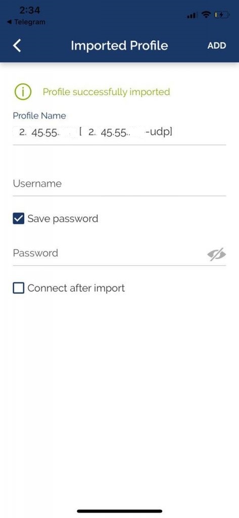 سپس گزینه Save password را انتخاب نموده و نام کاربری و رمز خریداری شده از سایت را مطابق تصویر جایگزین نموده و در انتها در بالای گوشی خود گزینه ADD را انتخاب می نمایید.